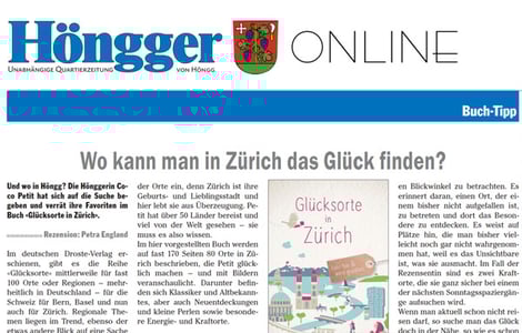 Im deutschen Droste-Verlag erschienen, gibt es die Reihe «Glücksorte» mittlerweile für fast 100 Orte oder Regionen – mehrheitlich in Deutschland – für die Schweiz für Bern, Basel und nun auch für Zürich. Warum es sich trotzdem lohnt, sich mit dem Buch auf die Suche nach dem Glück zu begeben...