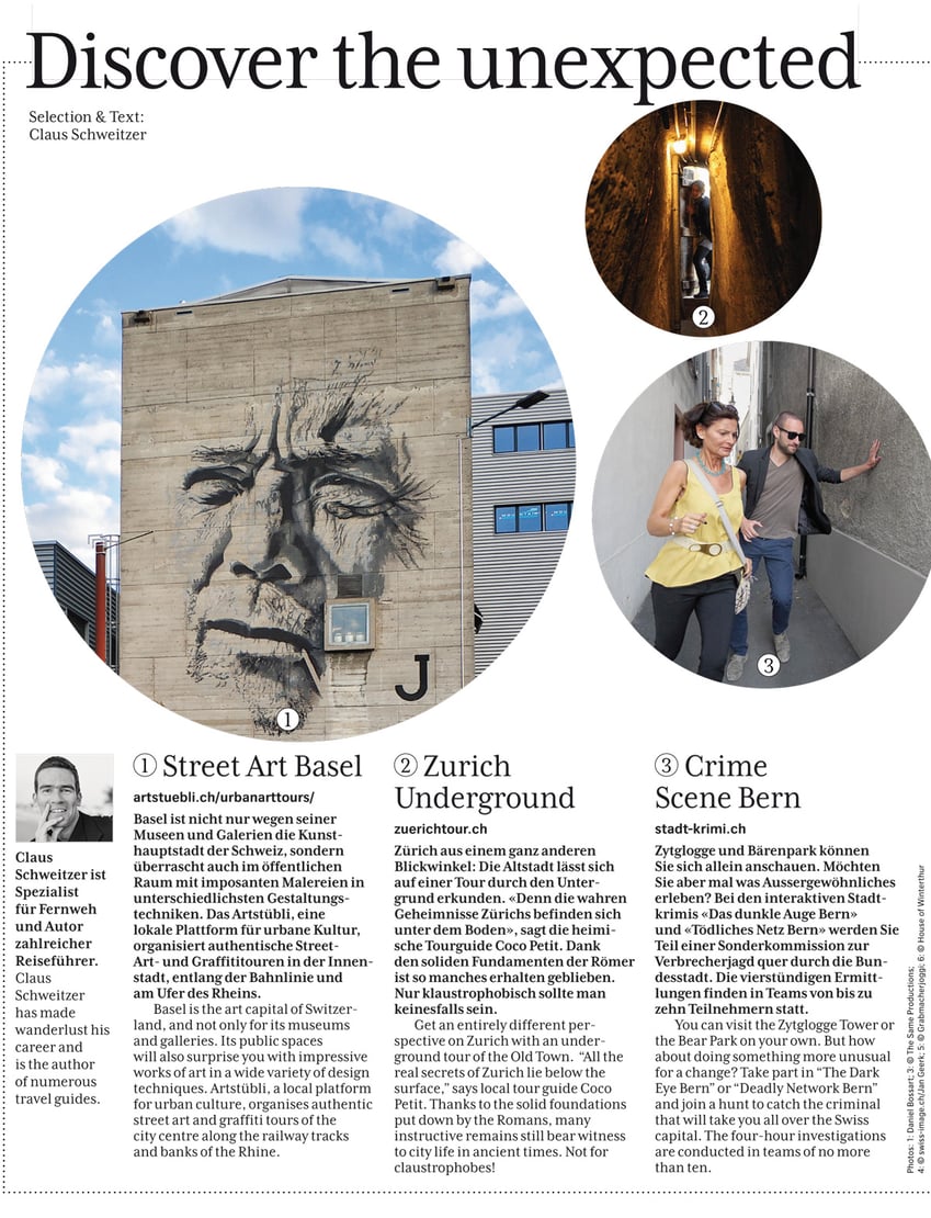 Die Underground Tour fliegt mit dem SWISS Magazin im Oktober 2019 um die Welt! Achte dich auf das Magazin in der Sitztasche aller SWISS-Flüge.